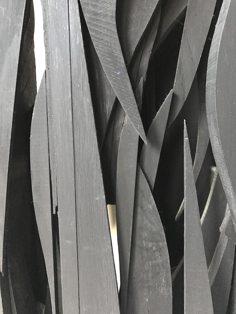 Like Louise Nevelson who was working in a similar vein on the East Coast. Faralla relied on found wood, often painted black or white, with incorporated found glass pieces to make his formal and textured art pieces.