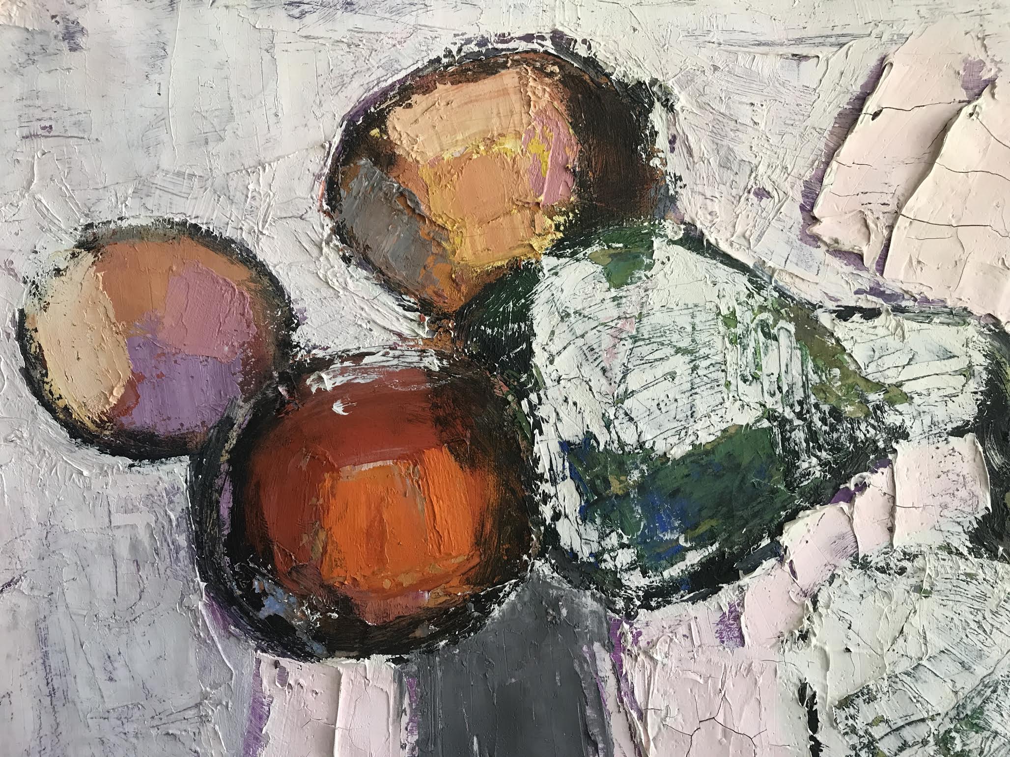 Rene Pinchuk (1929- ) “Oranges & Afterimage”, oil on canvas, 18 3/4 x 28 inches, 1968. Signed lower right, “Rene”, and on the reverse of the canvas with his full signature and date.